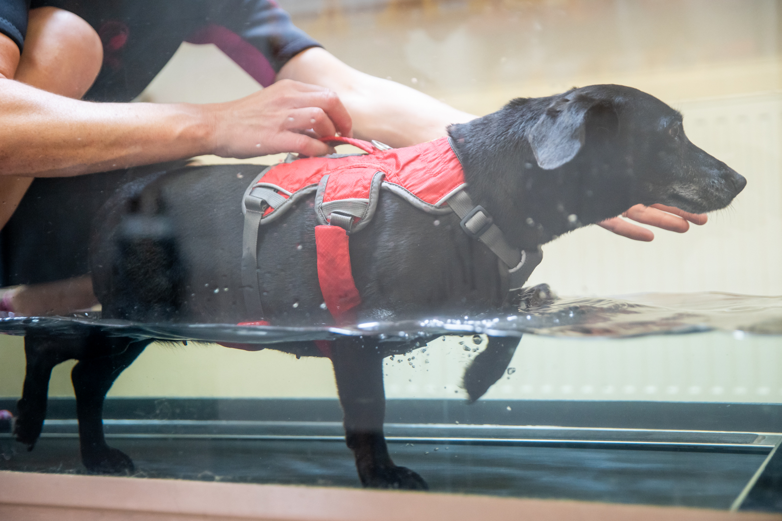 The first appointment will be primarily to assess the dog on land, introduce them to the treadmill and make a plan. The physiotherapist will examine the dog’s posture, gait, muscle mass and tone, joint range of motion and neurological deficits where applicable. We will demonstrate and prescribe home exercises and discuss home management techniques to suit your dog. We will encourage your dog to walk through the treadmill with rewards to make it a good experience for them. We will only fill the treadmill with water and start the belt if the dog is confident and happy but often this session is used for desensitisation.